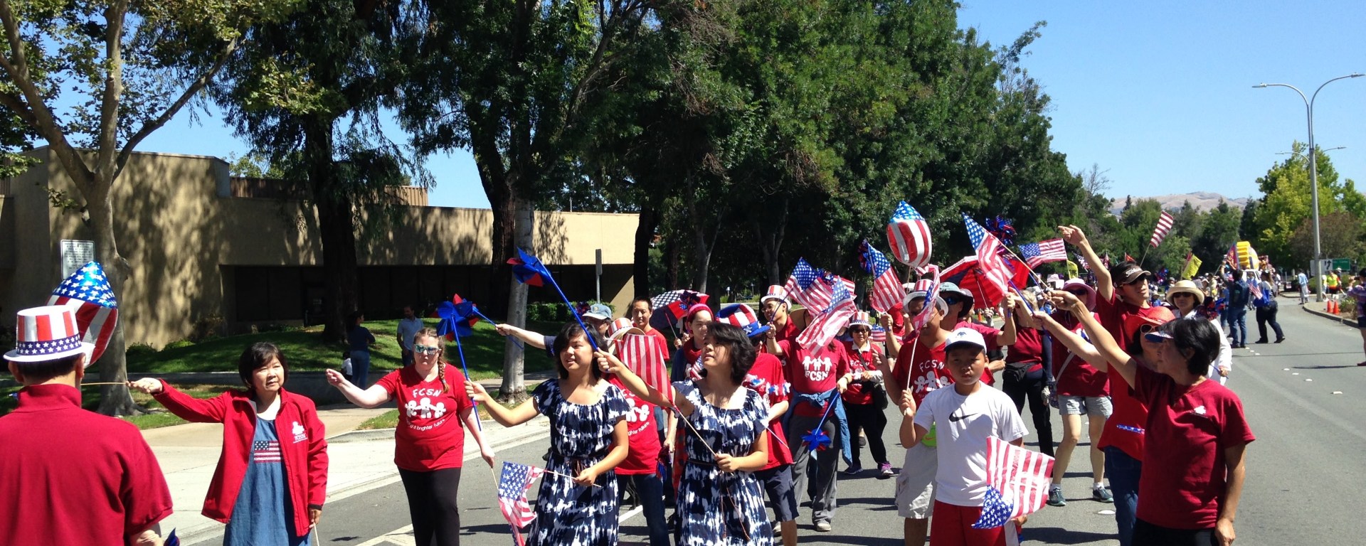 On July 4thย 2017, on a bright sunny morning, FCSN participated in the Fourth of July celebration and parade in Fremont. Over 50 FCSN families/friends showed up and joined teams organized by CBC (Citizen for Better Community). We gathered around 9:30 AM in front of the Fremont Main Library, and the parade got started around 10:30 AM. We marched along Paseo Padre Blvd. heading north towards Mowry Ave.. Along the way, Linmei led the team with a dance routine while following the music from a loud speaker. As we walked and danced, our team was warmly received with cheers and applause from the crowds. The march ended half an hour later at Walnut Street. Afterwards, we all enjoyed ice creams for a hard dayโs work.