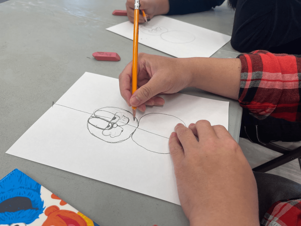 Each class begins with choosing a specific cartoon character to focus on. Then, the students begin line exercises. It is a warm-up and preparation for the instructions for the actual character drawing, as well as a good technical exercise. Riley pieces together the cartoon characters with lines and shapes. Riley has had to change her approach to drawing for the students: “When I started, I typically learned to do it from shapes,” she says, “but these students might have a bit of trouble drawing perfect ovals or circles.” She tries to lay a foundation for them, tackling body parts line-by-line. Riley notes how observant the students are, and how they see what she is doing and are able to replicate that on their own papers. “There’s a lot of constructing and trusting the process,” she explains. At the end of the class, all the students hold up their completed projects for everyone to see and celebrate their accomplishments together. Then, they discuss what characters they want to draw next time.