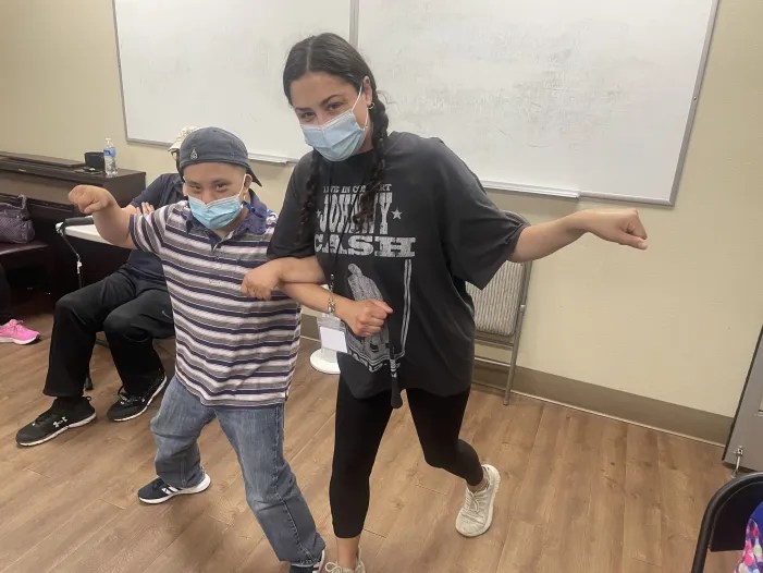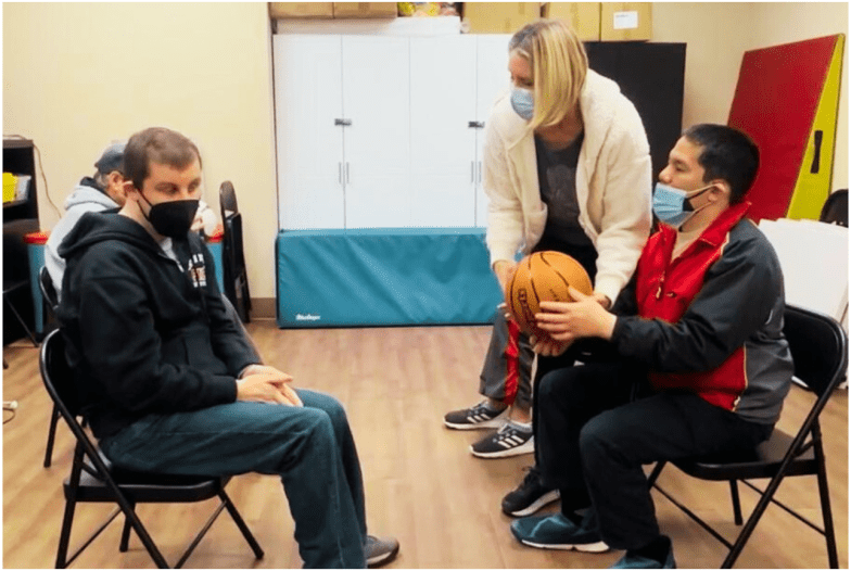In our second group we always start with a dance circle. This evolved over time as we learned how to motivate them. Each client needs to go in the middle of the dance circle. The person in the middle is then followed by the rest of us. We all have so much fun doing this! There are always big belly laughs as we let loose and have fun! This group hasย accomplished amazing feats. They have perfected a one-minute plank, pushups, and so many other physical endeavors. But the mostย amazing transformation is the social engagement. We have seenย tremendous growth with eye contact and how clients that couldnโt even look us in the eye when we started are actively doing exercises in teams with a partner and having fun!
