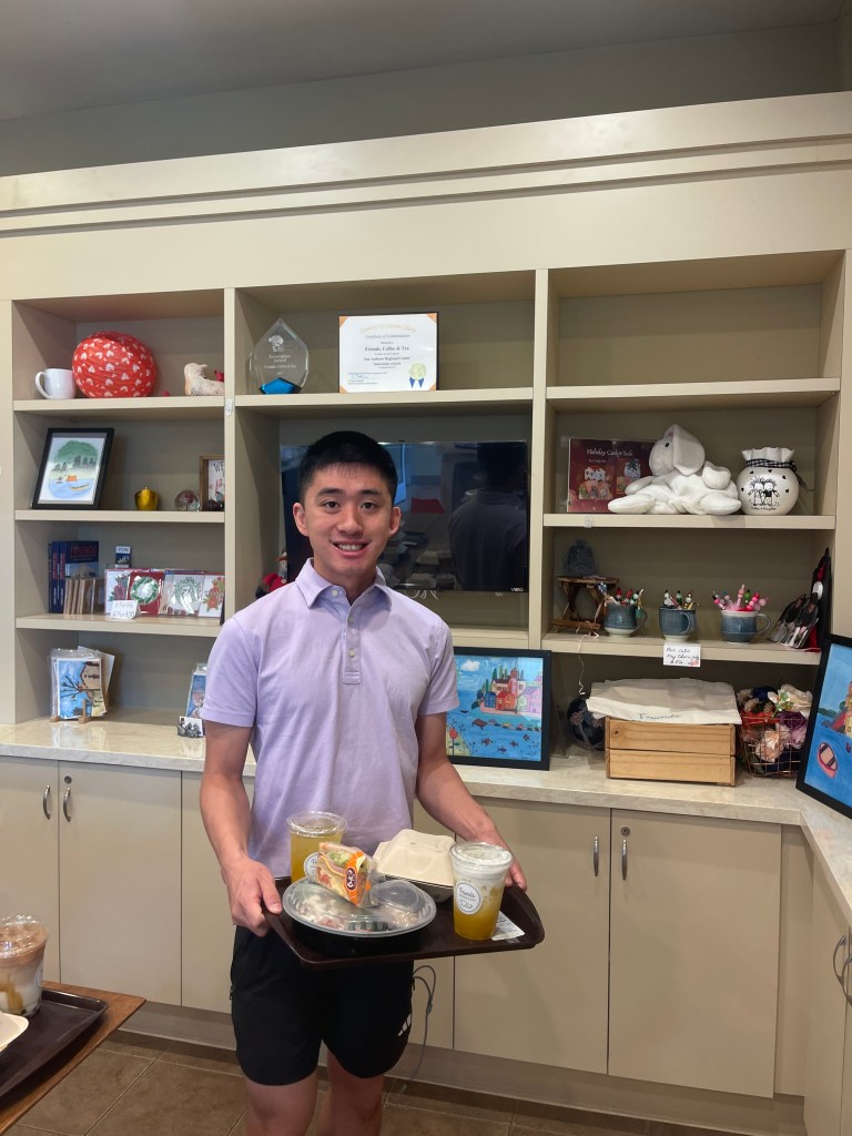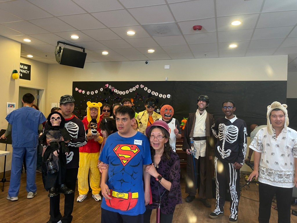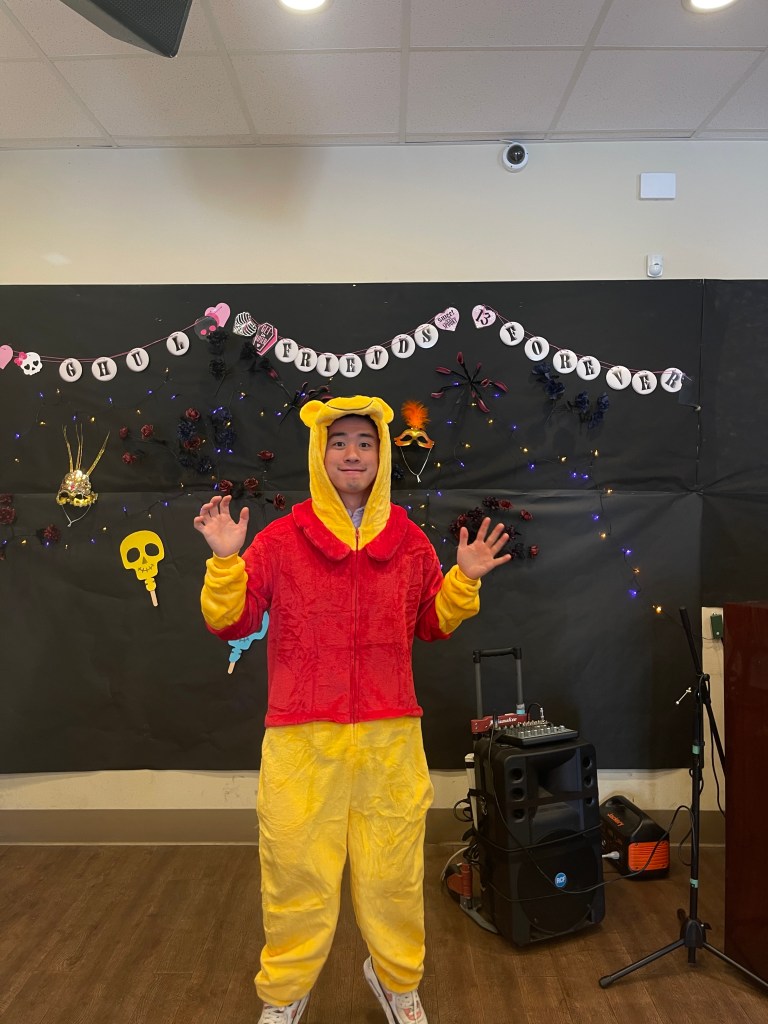 Yesterday I went to a FCSN halloween party. The party was at the South Bay Center. I dressed up as Winnie the Pooh. First I ordered food from Friends Coffee & Tea. I ordered rice with meat and a sandwich.