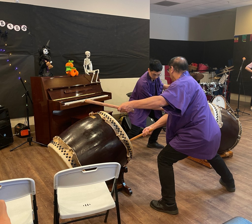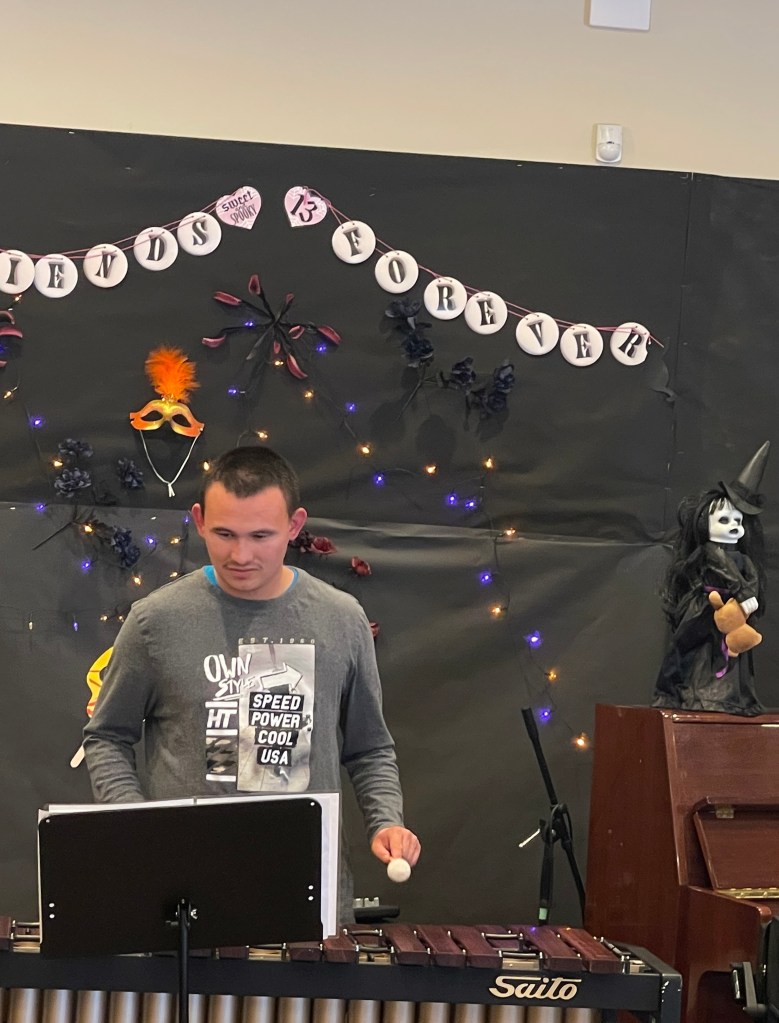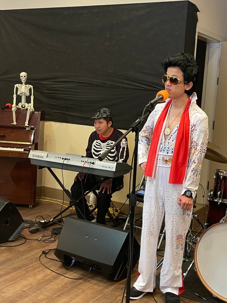 Then I watched friends playing xylophone and drums. Another friend was singing and dressed up like Elvis Presley who was a singer of rock and roll.