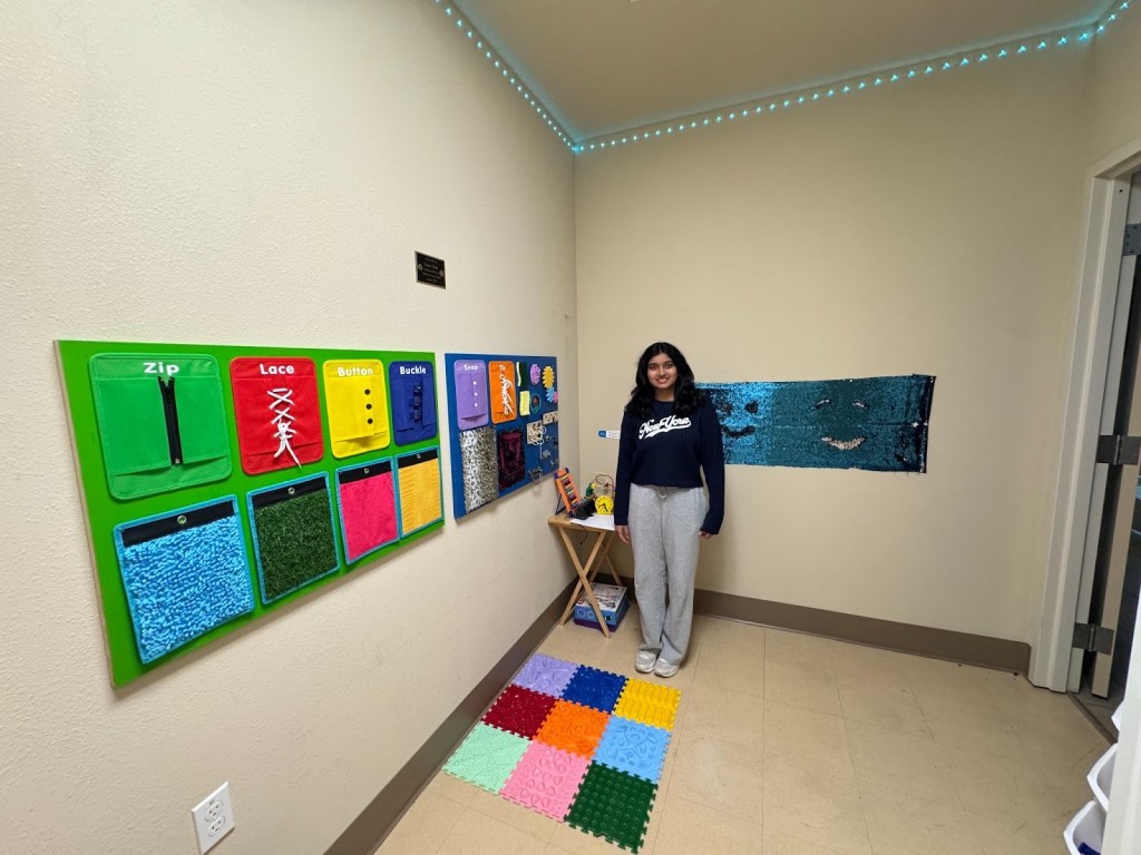 However, her creativity was not limited to STEM lessons. After noticing how easily some students became overstimulated, Saanvi designed a sensory room: a calming space for students of all ages to relax when feeling overwhelmed or having sensory overload. The room is softly lit with gentle music playing in the background and filled with sensory toys to create a soothing atmosphere. Students have found the room deeply helpful; when a student feels overexerted or anxious, they can step inside to take a break where they rest, recharge, and find comfort in activities that bring them joy.