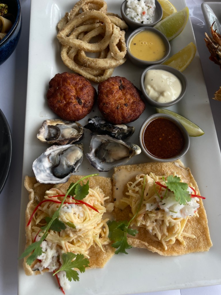 I ate seafood dishes at the marina dock. I also drank sprite.
