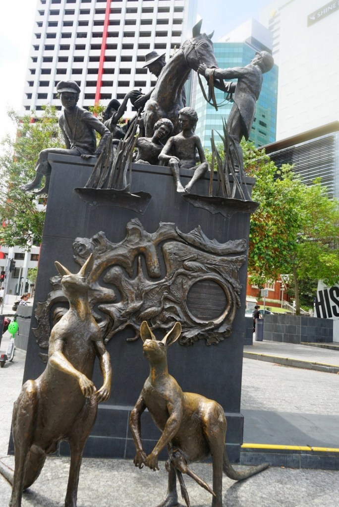 The sculpture was a mommy kangaroo and baby kangaroo. The sculpture was in front of Brisbane city hall.