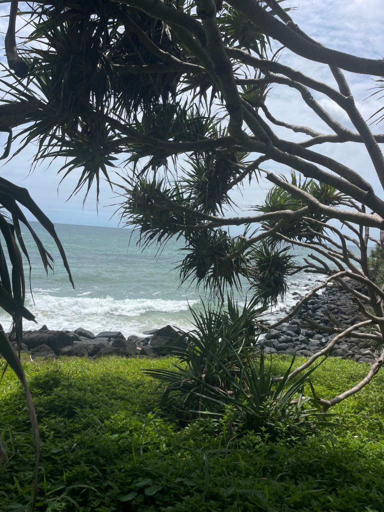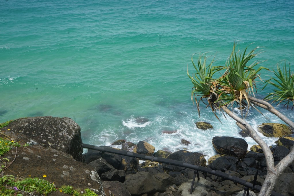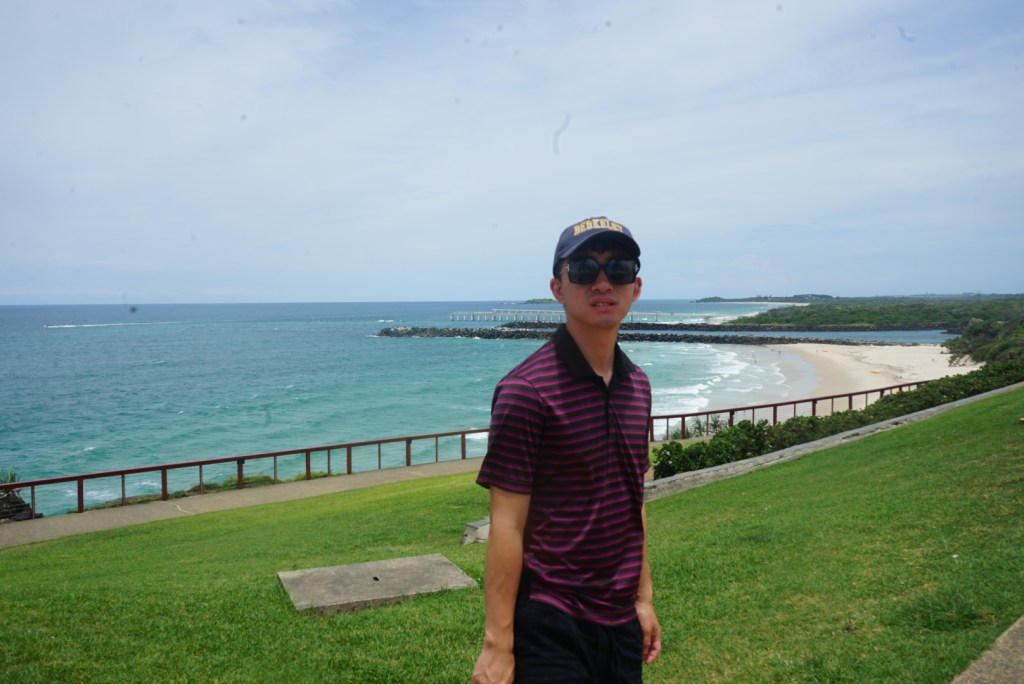 In the morning we went to Burleigh Head National Park hiking. I saw a blue ocean and green grass.