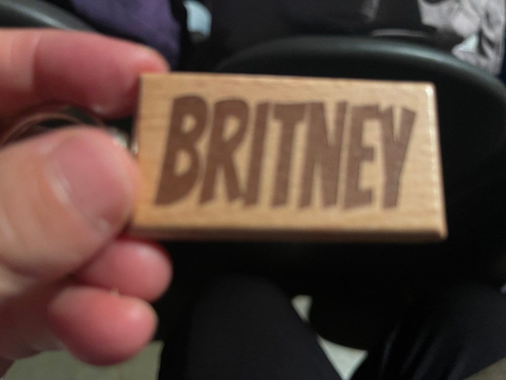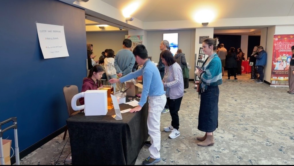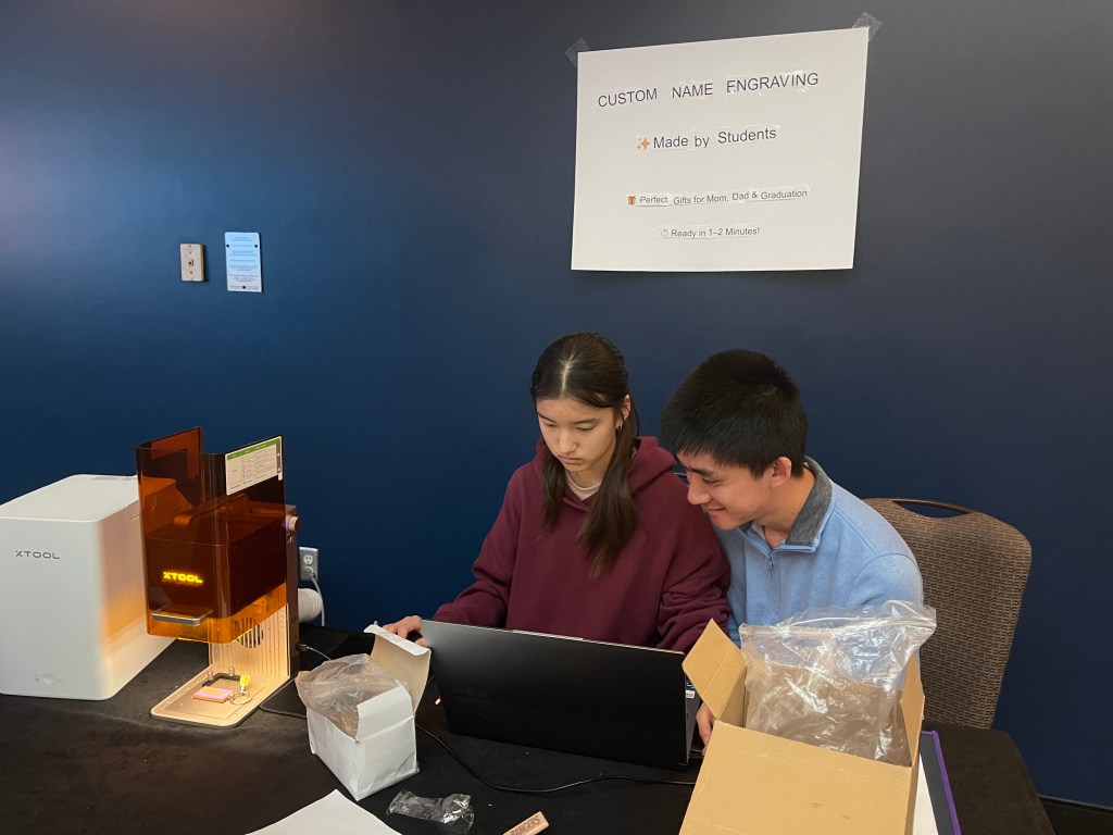 Before the talent show I helped set up a booth for laser engraving. We engraved the name on keychains. I worked with a youth volunteer, Kewei. She designed the name on the computer. Then I helped operate the machine to engrave the name.