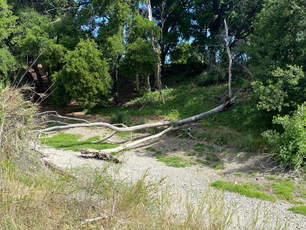 The creek was dry and a fallen tree was in the dry creek.