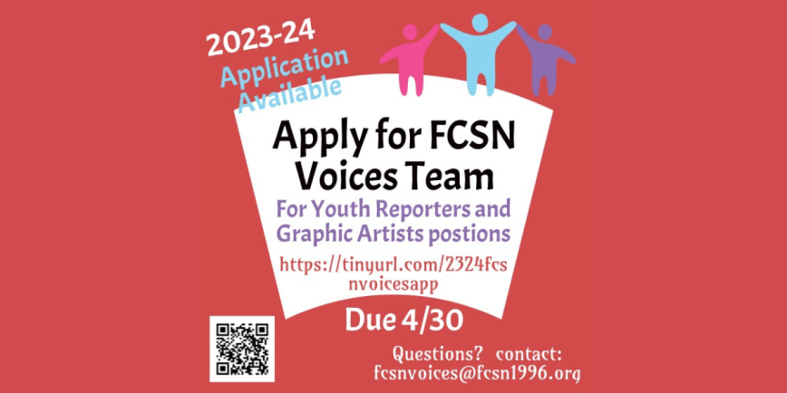 Apply to join FCSN Voices as a Youth Reporter and/or Graphic Artist for the 2023-24 year! The application only requires a brief personal statement and samples of writing/graphic design work.…